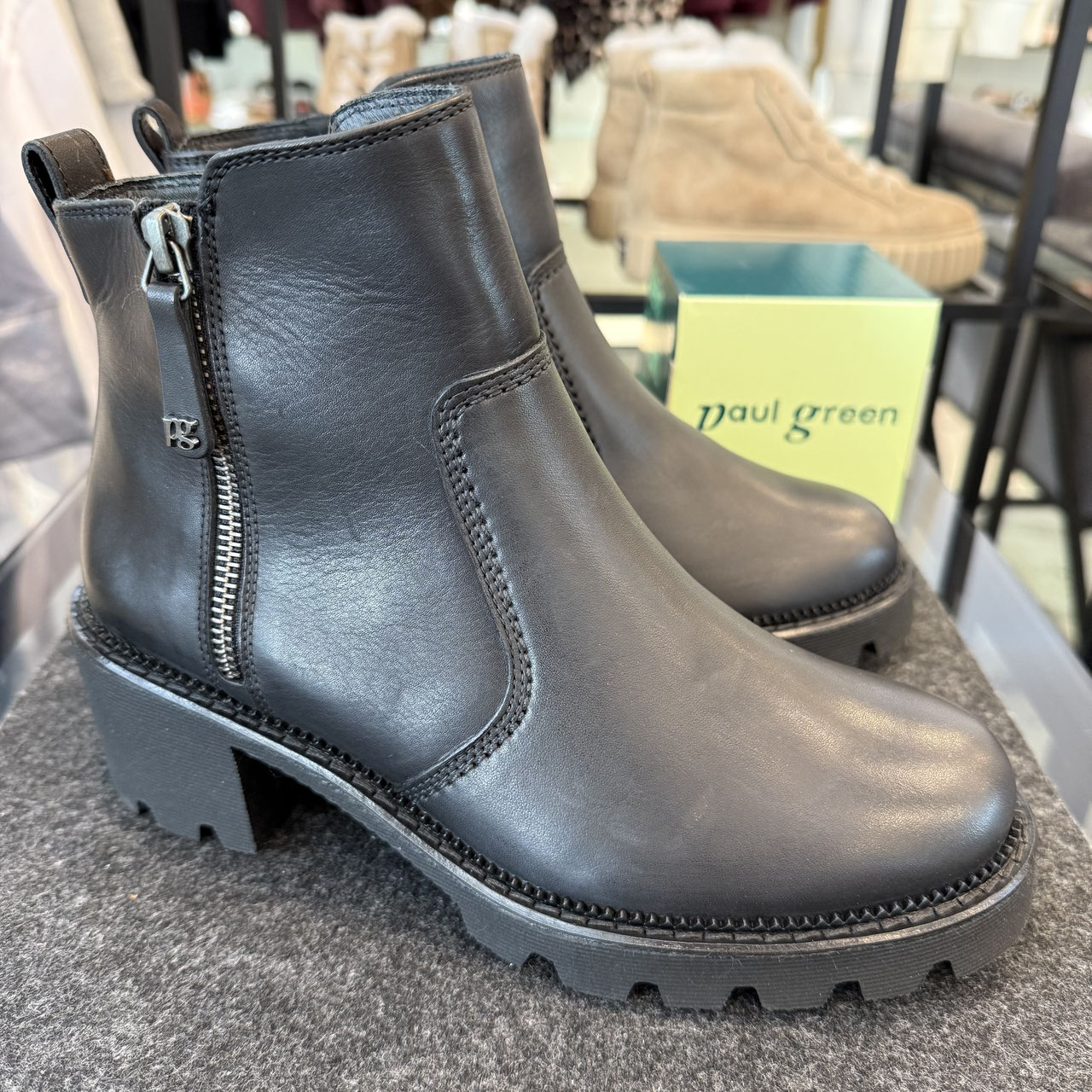 Stiefelette von Paul Green. Wunderbar weiches und doch grobes Leder ist hier ganz in schwarz gehalten und bringt durch die Struktur Leben in den Schuh. Die Sohle ist extra leicht und hat ein schönes Profil, welches den winterlichen Look unterstreicht. Der Absatz ermöglicht einen sicheren Stand und streckt gleichzeitig gekonnt das Bein. Der Reißverschluss auf der Außenseite lockert auf, der richtige Reißverschluss befindet sich innen. Innen ist der Schuh warm gefüttert, so dass er angenehm auch an den kalten Tagen getragen werden kann.