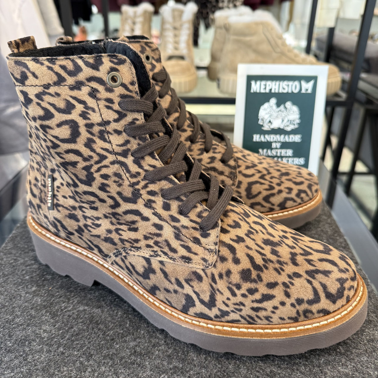 Stiefelette von Mephisto. Frischer Leo-Look wird hier über das weiche Veloursleder gespielt. Die Halbschuh Sohle ist extra leicht und bietet ein Herbstlich angemessenes Profil ohne grob zu sein. Die Senkel ermöglichen die perfekte Passform und einmal gebunden wird einfach über den innenliegenden Reißverschluss eingestiegen. Die Stiefelette ist innen schön weich abgepolstert und bietet zudem eine Sohle, welche auf Wunsch zum wechseln ist.