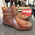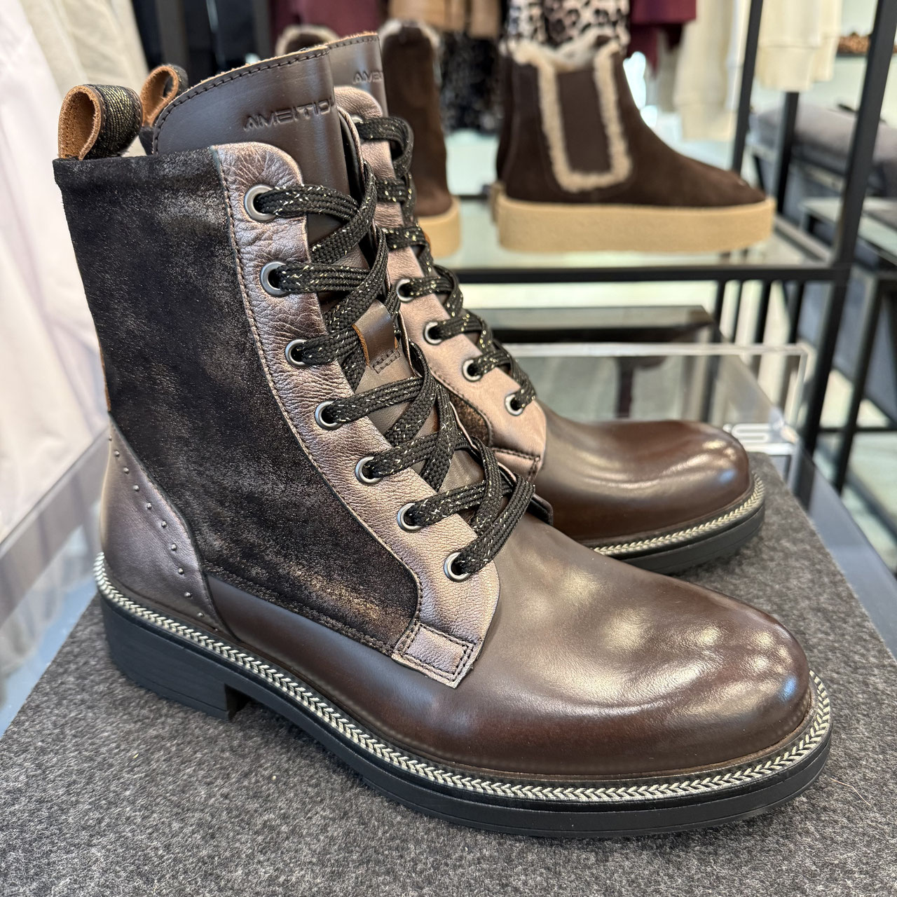 Stiefelette von Ambitious. Braunes Leder wird bei dieser Stiefelette um feminine metallic Details ergänzt. Vorn ist er clean gehalten und wirkt schon fast etwas derb, am Schaft und an der Ferse kommen dann die Details zum Einsatz, welche den Look auffrischen und der Stiefelette ihren Look geben. Durch die Schnürung lässt sich der Boot individuell anpassen und dann ist er einfach über den innenliegenden Reißverschluss anzuziehen. Innen bietet er eine schöne Polsterung und hat ein Fußbett, welches auf Wunsch zum wechseln ist.