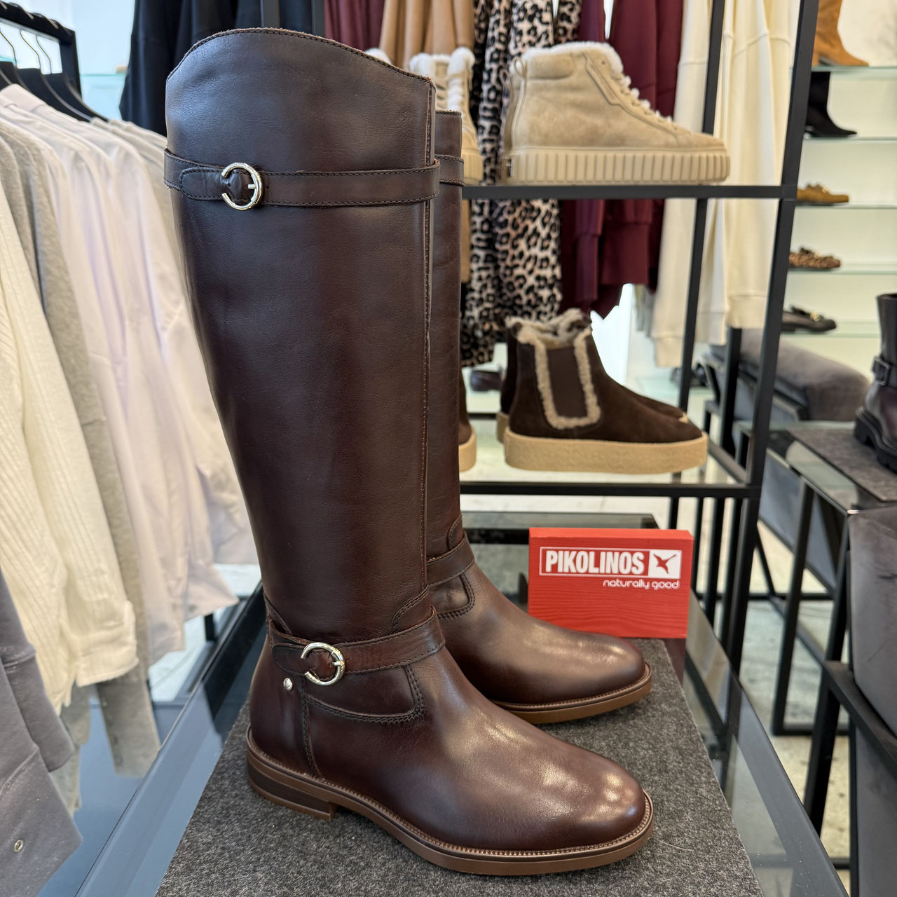 Stiefel von Pikolinos. Edler Reiterstiefel, welcher durch das dunkel braune Leder wunderbar zur Geltung kommt. Die flache Sohle mit dem dezenten Absatz unterstreicht den Look gekonnt. Clean in der Optik lebt der Stiefel über das tolle Leder, unterstützt wird die Optik über die beiden Schnallen, welche das gewisse Chic in den Stiefel bringen. Der Schaft ist oben abgerundet, so dass er perfekt zu jeden Looks passt. Innenliegend der Reißverschluss für den einfachen Einstieg und dazu dann das Fußbett, welches auf Wunsch zum wechseln ist.