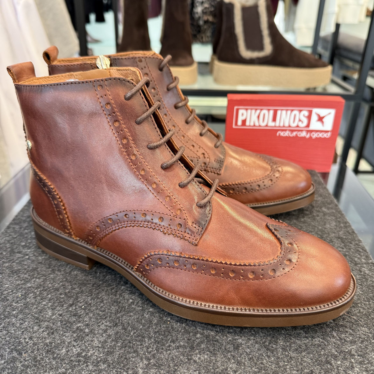 Stiefelette von Pikolinos. Edel und doch sportlich kommt diese Stiefelette auf feinem braunen Leder. Die Lochung und dazu die Senkel verleihen den tollen Look. Dazu lässt sich der Schuh über die Bänder natürlich perfekt individuell einstellen. Innenliegend ist der Reißverschluss, so dass man einmal gebunden, einfach in den Schuh steigen kann. Egal ob zu Hosen oder auch zu Röcken, diese Stiefelette unterstreicht den Look. Zusätzlich ist das Fußbett auf Wunsch zum wechseln.