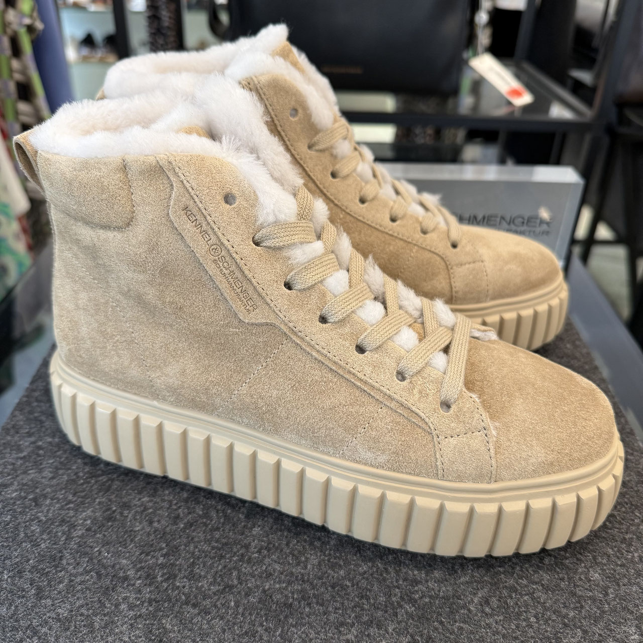 Sneaker von Kennel und Schmenger. Ein schöner Sneaker für die kalten Tage oder für alle, die auch im Winter gern Barfuß unterwegs sind. Oben das gut zu kombinierende anschmiegsame Veloursleder in beige, die Sohle in neuer Optik, welche sich farblich und auch von Design schön an das Oberleder anpasst. Innen ist der Sneaker dann komplett aus Lammfell, so dass er wärmt, sofern dies nötig ist und sehr bequem zu tragen ist.