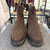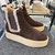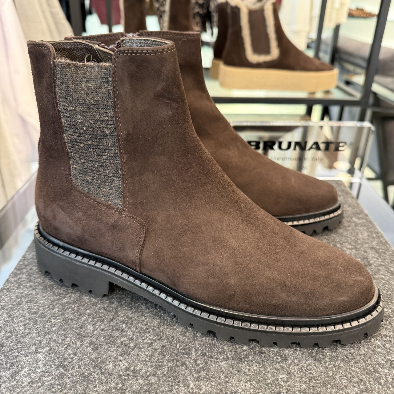 Stiefelette von Brunate. Schönes feines Veloursleder in braun dominiert bei dieser Stiefelette die Optik. Das cleane Design lässt das hochwertige Leder wunderbar zur Geltung kommen. Der Gummizug an der Außenseite lockert etwas auf, ohne das schlichte Auftreten zu stören. Innenliegend ist der Reißverschluss für den komfortablen Einstieg. Die extra leichte Sohle mit dem angemessen Profil fügt sich schön in das Gesamtbild ein. Innen ist er ebenso hochwertig wie außen verarbeitet, so dass er sich sehr komfortabel trägt.