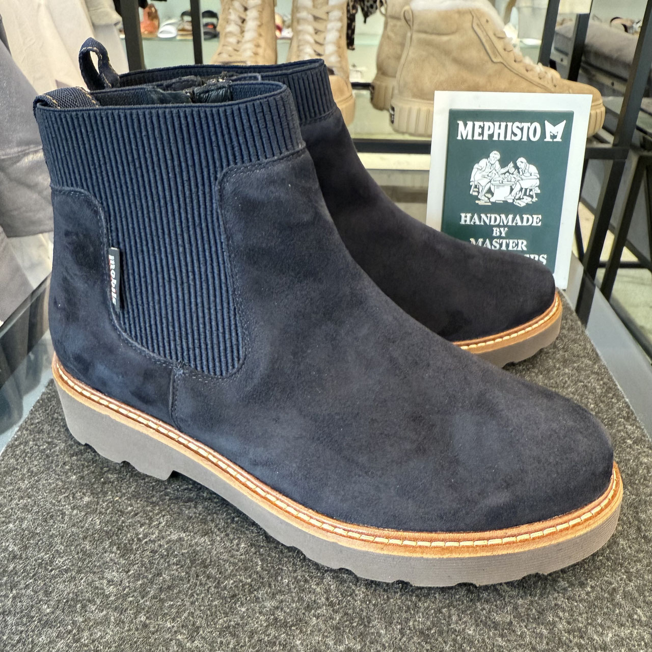 Stiefelette von Mephisto. Schönes weiches Veloursleder in blau schmiegt sich hier an den Fuß. Die extra leichte Sohle mit dem helleren Rahmen unterstützt die sportlich alltägliche Optik der Stiefelette. Der Gummieinsatz an der Außenseite sorgt für den schönen Halt um den Knöchel. Innen ist der Schuh extra abgepolstert, so dass er sehr angenehm am Fuß liegt. Das Reißverschluss auf der Innenseite ermöglicht dazu das komfortable Anziehen und das Fußbett ist auf Wunsch zum wechseln.