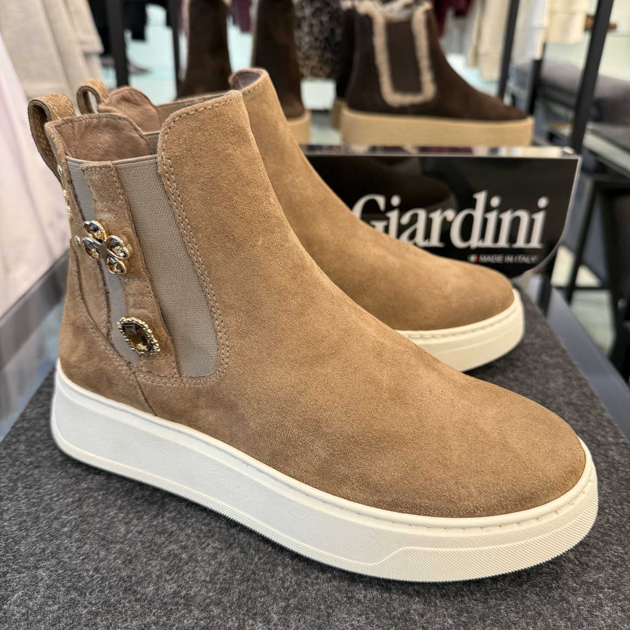 Stiefelette von Brunate. Höher im Schaft und damit nochmal deutlich winterlicher kommt diese Stiefelette in weichem hochwertigem kaki Veloursleder. Die Sohle hat ein perfektes Profil und bietet auch bei glatten Tagen den perfekten Halt. Die schlichte Optik lässt die hochwertige Verarbeitung und das perfekte Leder leben. Der Reißverschluss auf der Innenseite ermöglicht das einfache Anziehen und die schöne Verarbeitung auch im Schuh sorgt für den perfekten Komfort. Innen ist der Schuh mit weichem Lammfell ausgestattet, so dass er wunderbar warm hält.