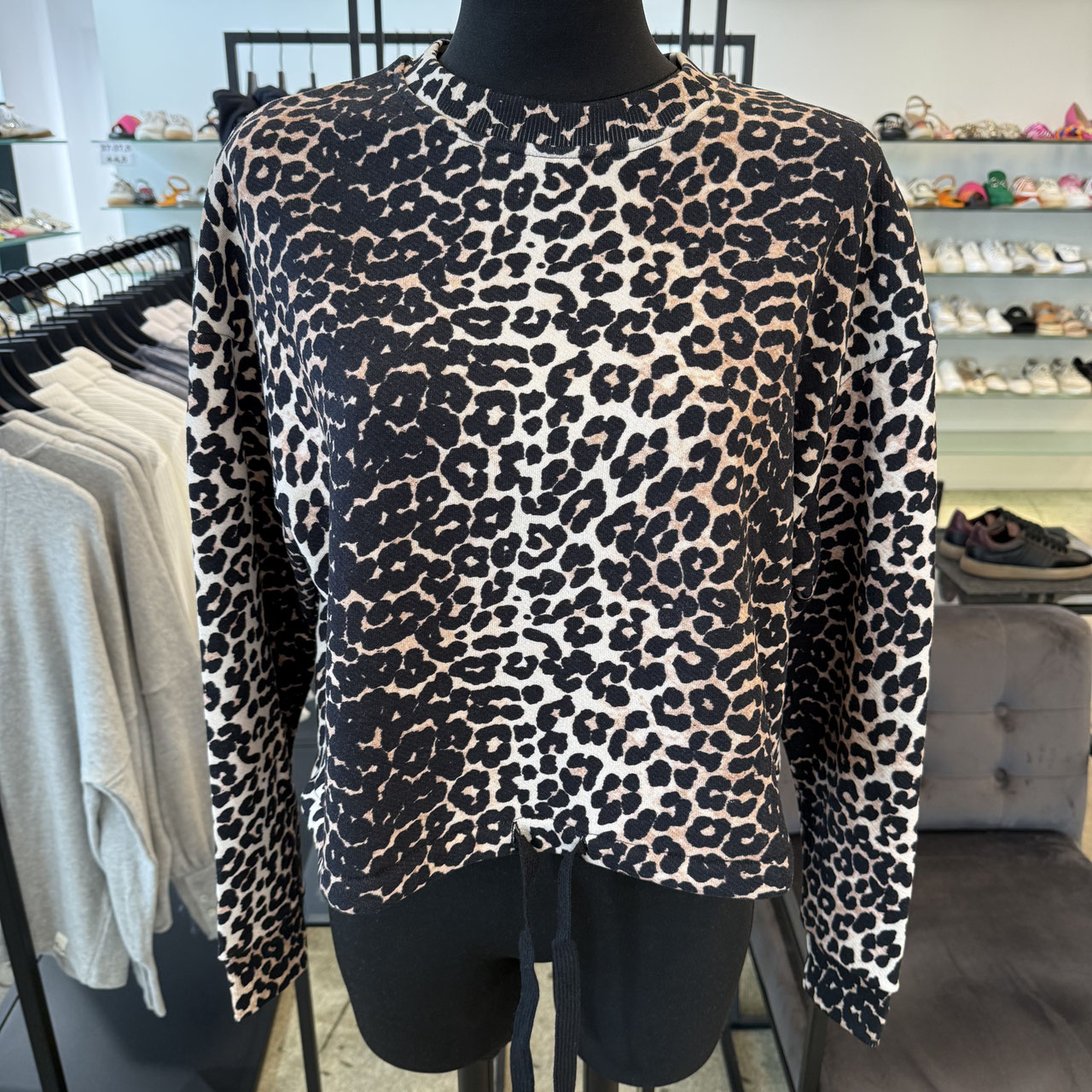 Sweatshirt von Cotton Candy. Frisches Sommerleo dominiert hier das Shirt, Leo als Trendthema wird somit konsequent umgesetzt. Der weite V-Ausschnitt ist sportlich used Look doppelt vernäht und bringt so etwas besonderes in das Shirt. Die Bündchen am Ärmen sind mit einem Gummizug ausgestattet, so kommt die Raffung gut zu Geltung und auch hier bringt der Schnitt sein gewisses Extra mit. Am Rücken ist eine extra Naht gesetzt, so dass auch von hinten betrachtet ein dezentes Highlight gesetzt wurde.