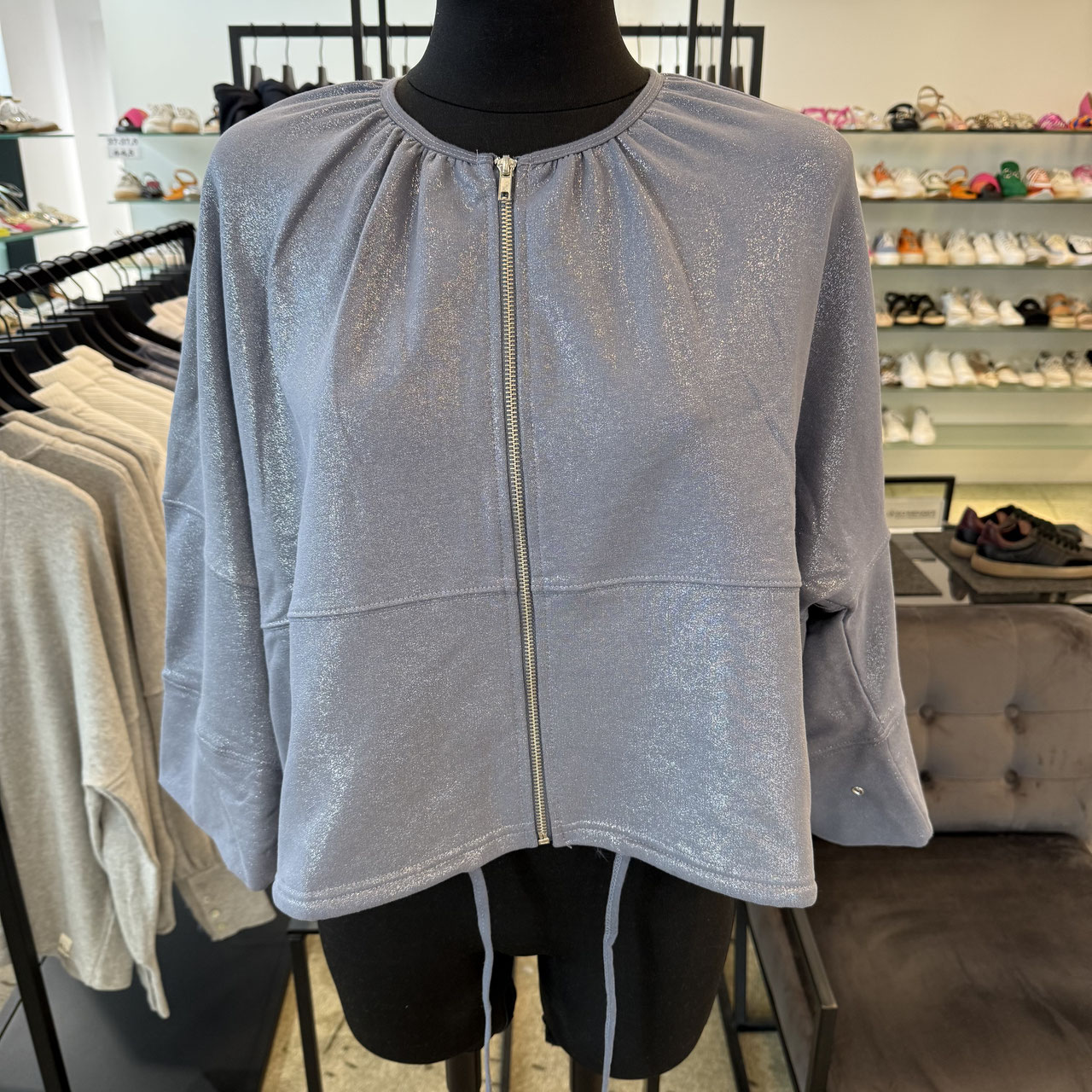 Sweatshirt von Cotton Candy. Cooles blau mit dezentem Schimmer macht die Optik dieses Shirts aus. Durch die Nähte und den fallenden Stoff wird eine schöne Optik erzeugt. Die Bänder lassen die Bündchen individuell verstellen, so dass sich viele Möglichkeiten der Kombination eröffnen. Einfach in der Farbe, lässig im Schnitt und einfach ein schönes It-Piece für die neue Saison.