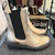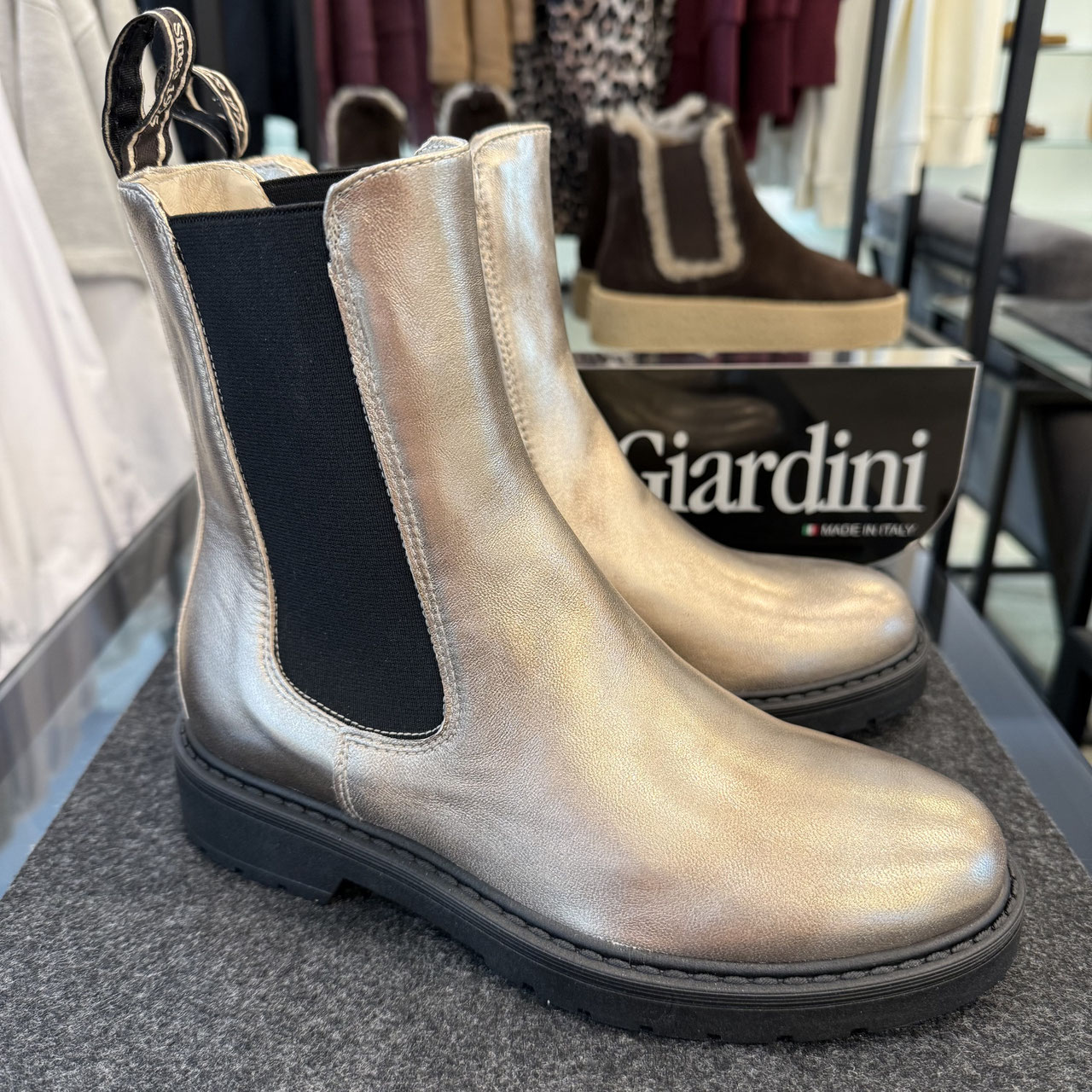 Stiefelette von Nero Giardini. Güldenes metallic Glattleder entfaltet hier seine Optik und macht diese Stiefelette zu einem gelungenen Hingucker. Gleichzeitig ist sie einfach zu kombinieren, da das Leder nicht aufdringlich wirkt. Als Chelsea Boot hat er zwei Gummizüge, welche den guten Halt bieten und ebenfalls ein schöner Kontrast zum Leder sind. Die Sohle ist klassisch flach gehalten und hat einen dezenten Absatz. Innen ist er komplett aus Leder und bietet eine Sohle, welche auf Wunsch zum wechseln ist.