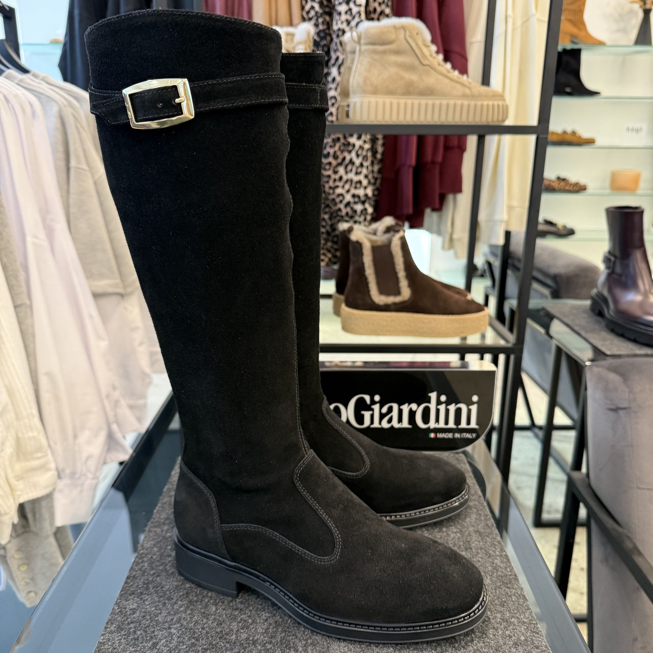 Stiefel von Nero Giardini. Weiches Veloursleder in schwarz entfaltet hier seine Optik, dezent angefettet bekommt der Schuh so seinen Charakter. Die Nahtführung unterstützt das Design und lockert gekonnt auf. Am Schaft ist eine Schnalle, welche das gewisse Chic in den Stiefel bringt. Die Sohle ist klassisch flach gehalten und hat einen dezente Absatz. Innenliegend der Reißverschluss, so dass man komfortabel Einsteigen kann, dazu dann das Fußbett, welches auf Wunsch zum wechseln ist.