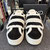Pantolette von Newd. Weißes Leder setzt hier einen gekonnten Kontrast zur schwarzen Grundform. Die Riemenführung vorn lässt dem Fuß Platz und packt gleichzeitig schön ein. Das Riemchen über den Rist lässt sich über den Klettverschluss einstellen und wird hier durch das Zebra-Leder aufgelockert. Zusätzlich zum Klett ist noch ein Gummizug eingearbeitet, so dass der obere Riemen schön anschmiegsam ist. Das Lederfußbett und die leichte Sohle sorgen dann für den guten Stand.